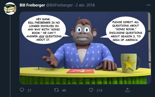 El guionista y humorista, Bill Freiberger, quien daba vida a Comedy Chimp y Lady Walrus en Sonic Boom, acaba de hacer público en su Twitter que abandona totalmente el proyecto de SEGA.